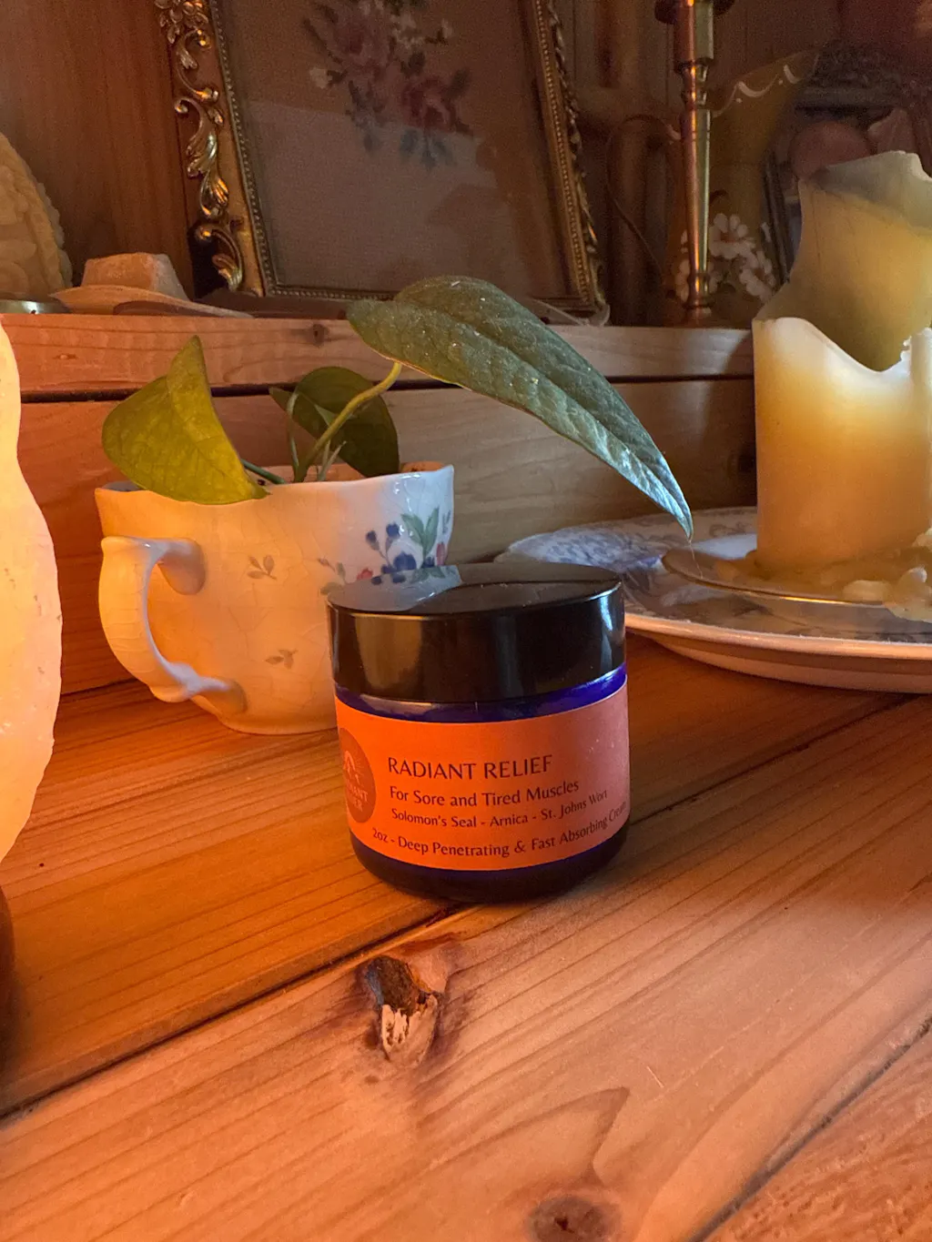 Radiant Relief Muscle Rub soothes tension and supports recovery naturally. Its a rich and fast-absorbing cream crafted to bring ease and comfort to tired muscles. Powered by nursing oils like jojoba and squalane, coupled with a calming blend of botanical extracts, Solomon's seal, Arnica, St John's wort with California poppy, comfrey, oat protein and sodium PCA it delivers deep hydration and restorative relief. A warm, grounding essential oil mix of peppermint, cypress and frankincense gently soothes the senses while promoting circulation. Designed for post workout unwinding or after a long physical work day Radiant Relief has you covered. Keep with you in your purse, gym bag or in your favorite personal care area. Keep out of heat and direct sunlight.